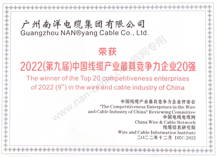 廣東線纜行業最具競爭力企業第一名、中國線纜行業最具競爭力企業20強、華南地區電線電纜研發(fā)制造龍頭企業
